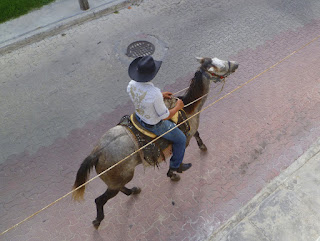 Late Thursday afternoon, I fell asleep on the sofa reading my Nook. I kept hearing a familiar sound, but couldn't figure out what it was. Suddenly I realized it was the rumble of horse hooves on the cobblestone street out front. I got to the front door in time to photograph the end of the rodeo parade on its way into El Centro. A friend staying farther south on the island described the parade as a bunch of people on horseback, Jesus in the back of a truck, and a golfcart with queens. (That would be rodeo queens.)